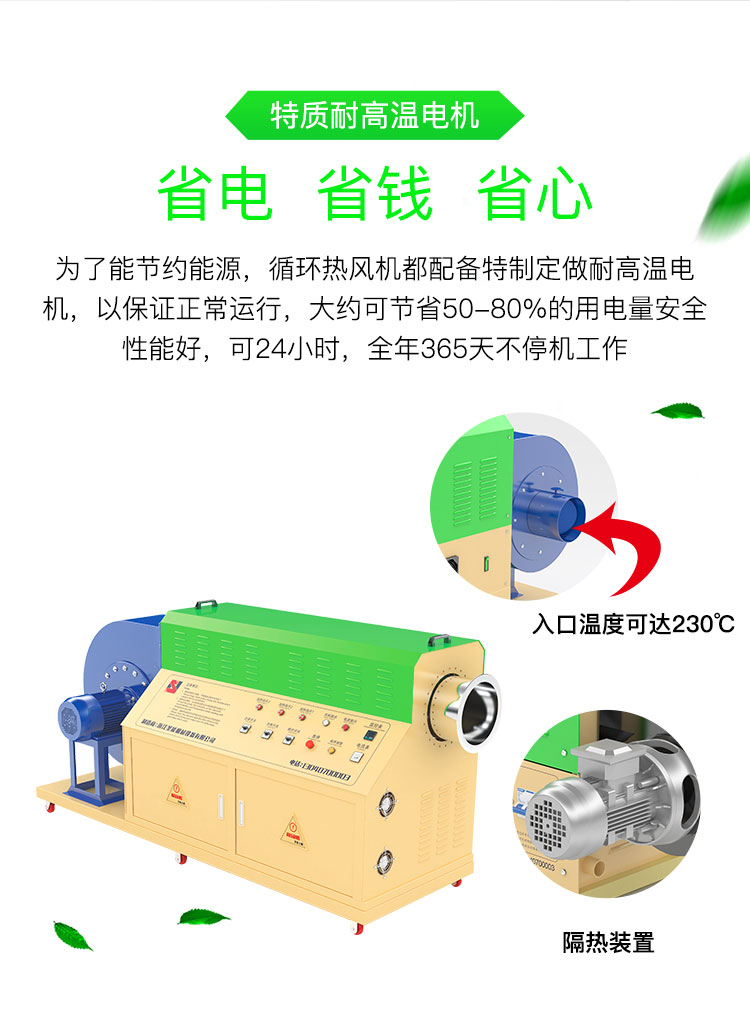 ④為了節約能源,循環型系列熱風機都配備特制定做耐高溫電機,以保證正常運行,大約可節省50-80%的用電量。